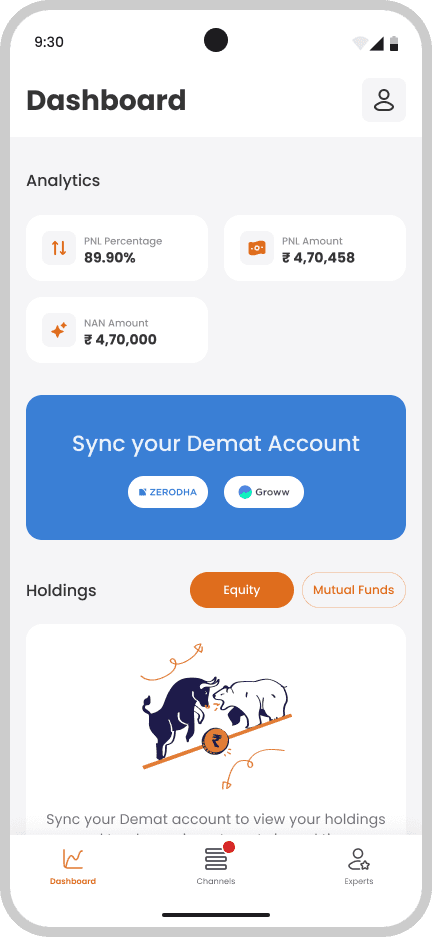The dashboard syncs with the user’s demat account to visualize real-time profit/loss (PNL). It separates Equity and Mutual Fund data, with intuitive tabs and a CTA for syncing accounts.