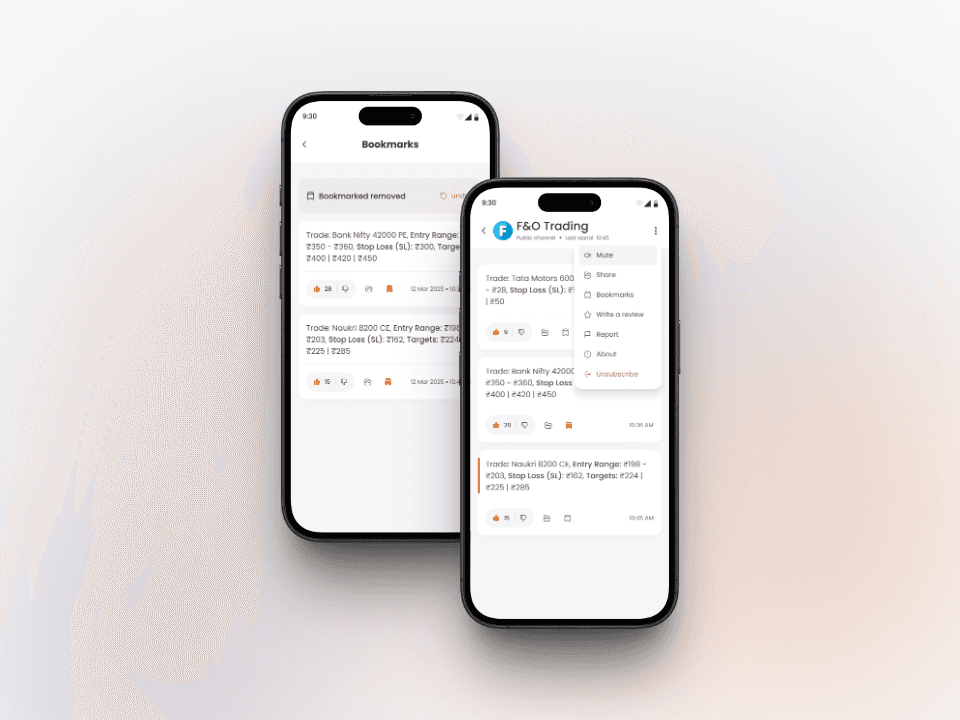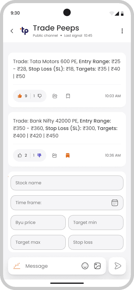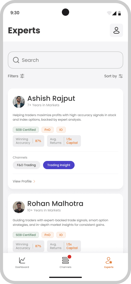 Users can browse SEBI-verified trading experts, view performance stats, and bookmark their favorite calls. Tags, filters, and trust badges help users quickly identify credible voices in the community.