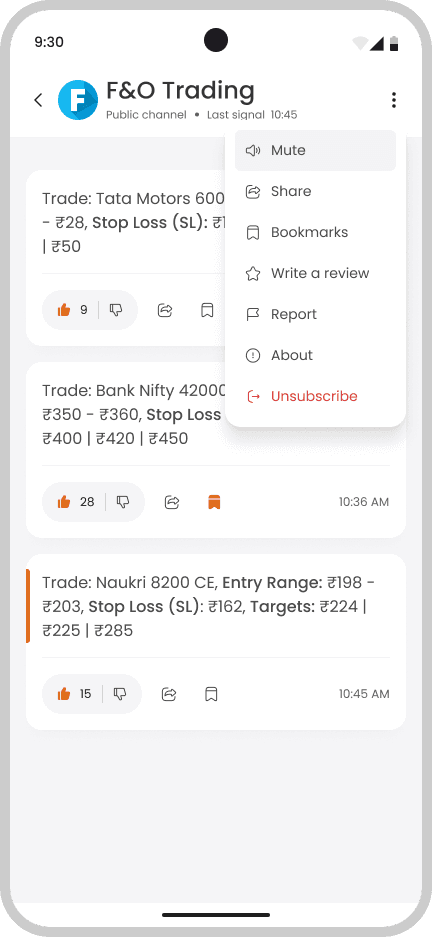 Each channel provides trade calls with entry, stop-loss, and target levels. Users can react, bookmark, or track signal history, making it easy to follow or ignore specific strategies.