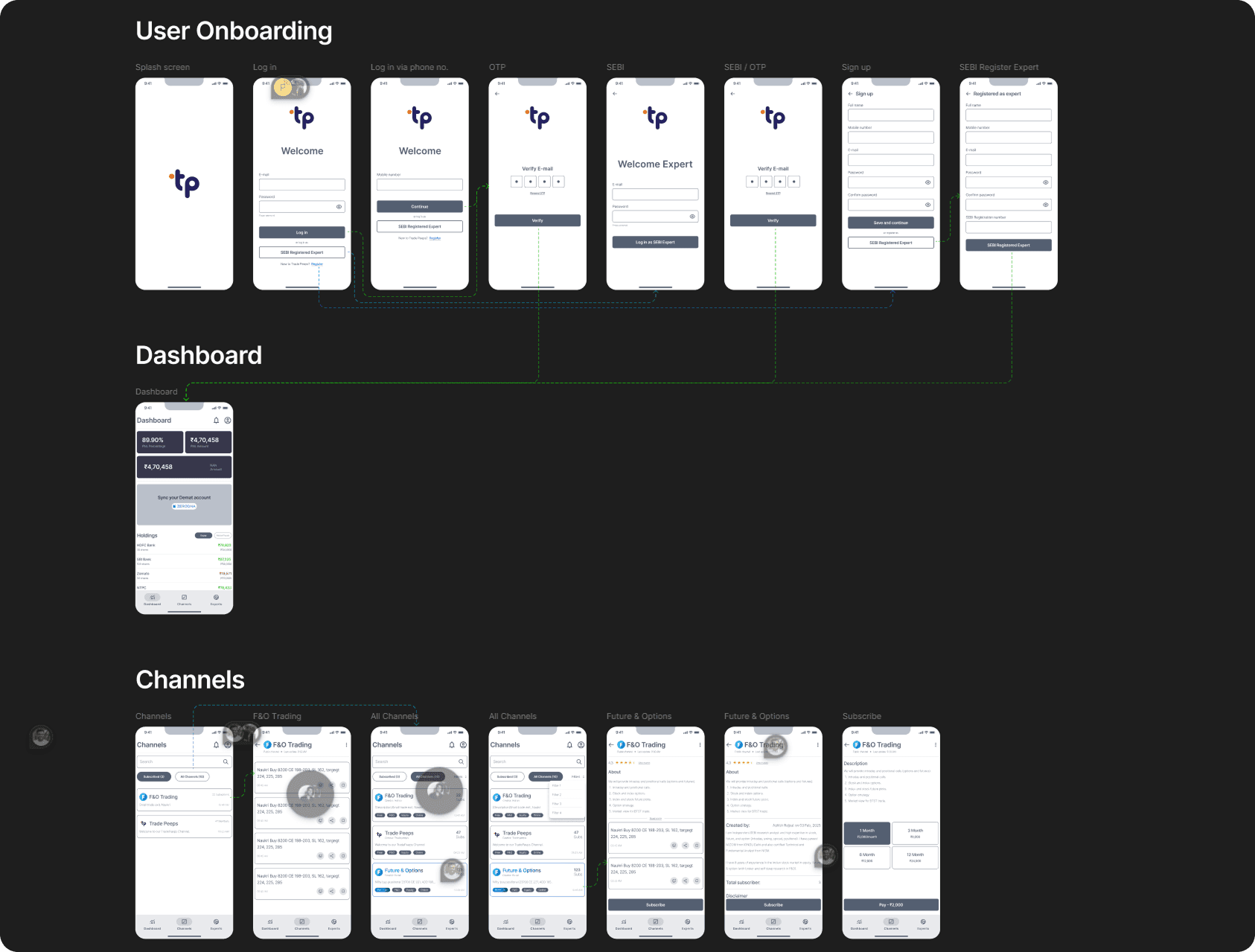 Using card-sorting and flowcharts, I defined key screens like Experts, Dashboard, Trade Channels, and Performance Analytics. The goal was to keep navigation lean yet powerful.