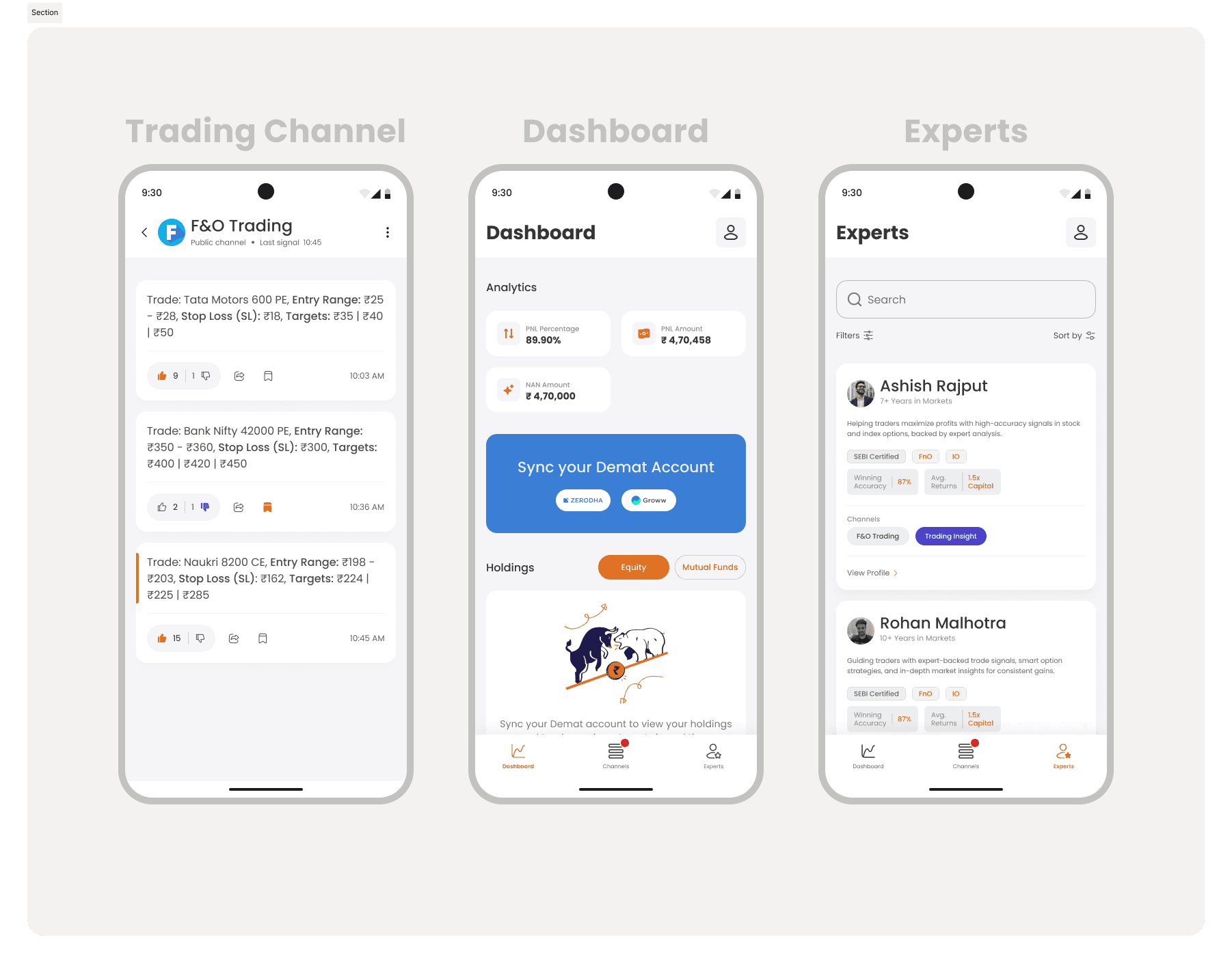 Low-fidelity sketches in Figma helped explore multiple layouts for expert cards and dashboards. After quick feedback loops, I developed a clickable prototype that mapped all major user journeys from syncing their demat account to reacting to a trade signal.